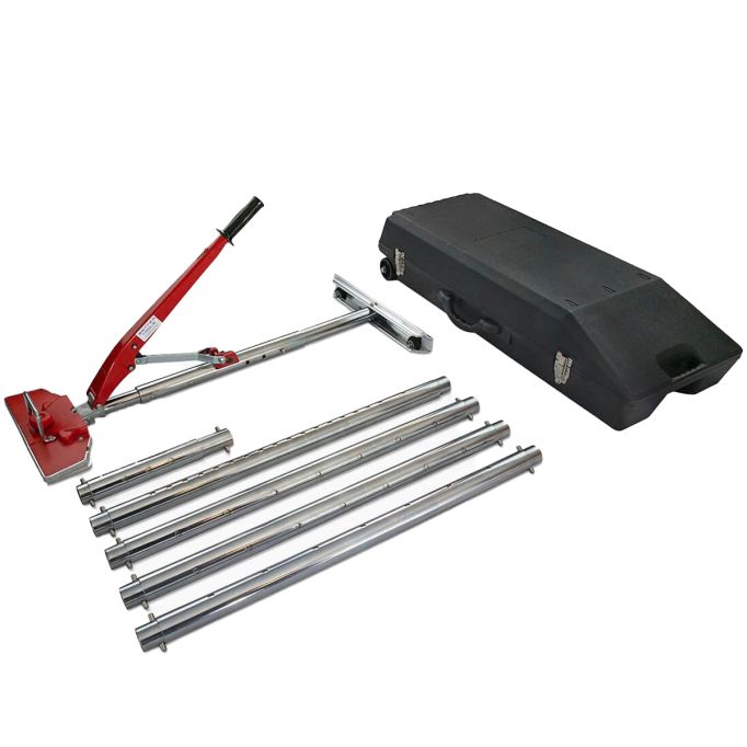 This swivel head power stretcher for wall-to-wall carpet installation has 5 lock points with 60 degrees of movement for angles and corners. Comes with 1 pc 18 hole tube, 3 pcs 7 hole tube, 1 pc tail block, 1 pcs transfe tube, and rigid blow case.