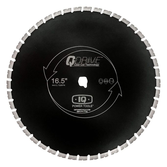 This 16.5" Q-Drive Arrayed Diamond Blade will cut a wide variety of masonry, concrete and stone products up to 40% faster than other masonry blades on the market. iQ's proprietary Q-Drive Cool Cut Technology, combined with the built-in vacuum on the saw, keeps the blade cool while cutting. The arrayed diamonds allow for faster and more consistent cutting speed, with a 2nd row of diamonds ready to cut when the first row begins to wear.