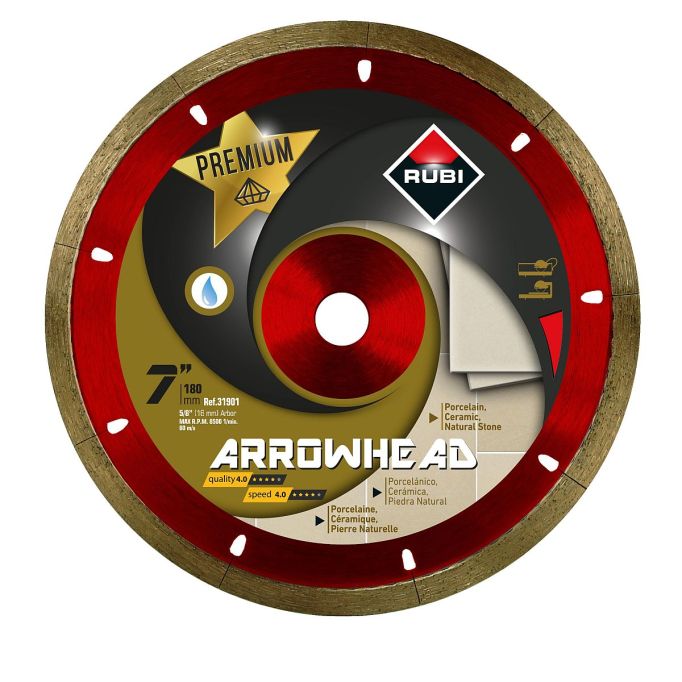 The Arrowhead 7" high performance diamond tile blade from Rubi is for fast and smooth cutting of ceramic, porcelain, marble and granite tiles. Only for straight cuts, not recommended for miter cuts.