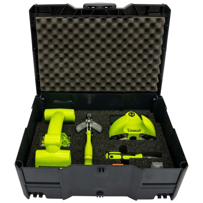 This kit from Wolff bundles together all of the essential tools needed for creating and installing design floors. Includes the Linocut 2, Wolff Chamfer King, Duo Pressure Roller, and mitre-box scissors.